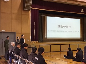 石川県管工事業協同組合連合会副会長 兼 弊組合理事長の茗荷谷豊をはじめ、副理事長、青年部会長、工業高校卒業生で配管工として日々頑張ってくれている2名の計5名で訪問し、高校1年生約200名にお話ししてきました!